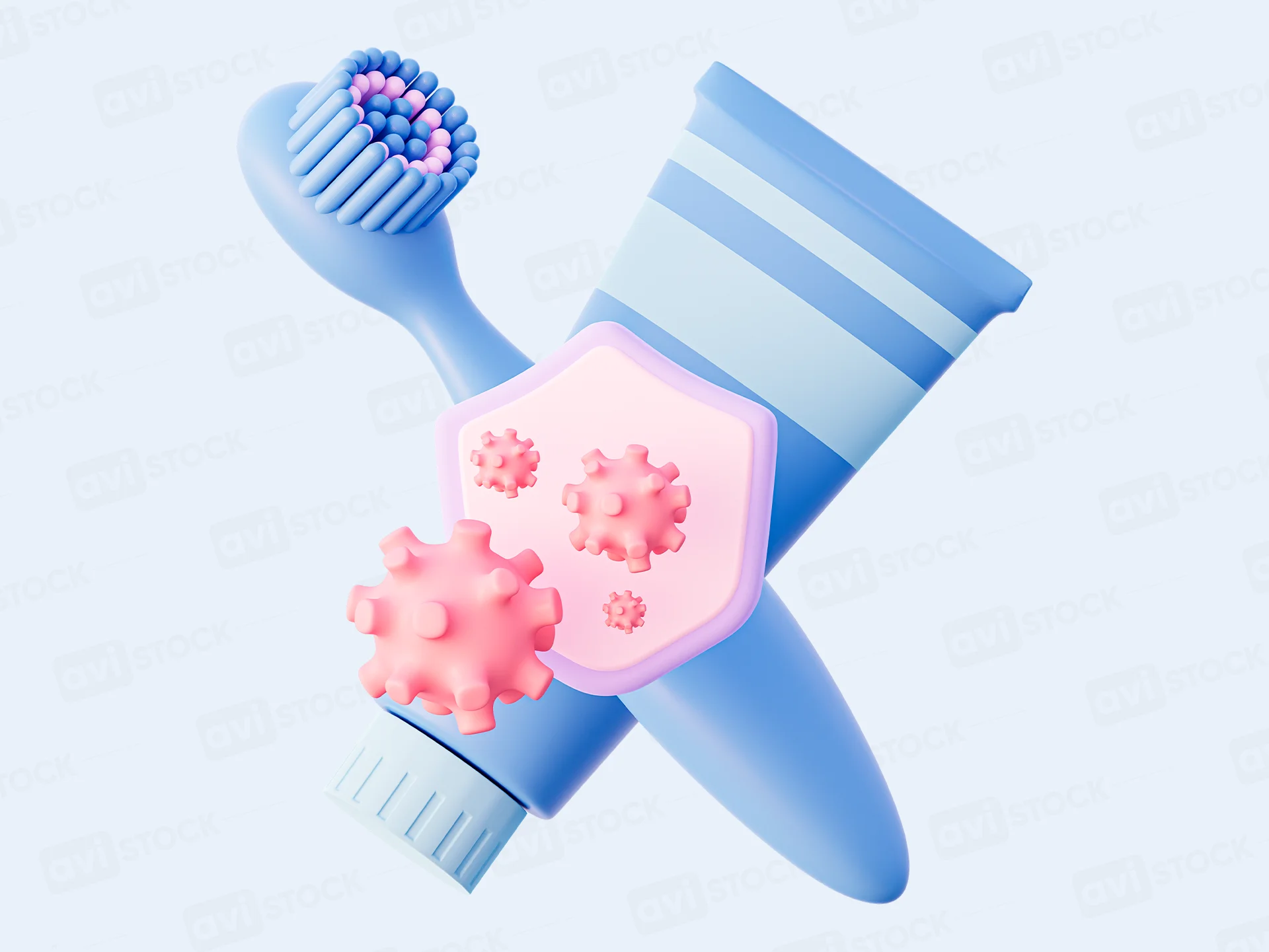 Скачайте 3D-иконку зубной щётки и зубной пасты с защитным щитом и бактериями — голубую 3D-иллюстрацию, символизирующую гигиену полости рта, чистоту, защиту от кариеса и антибактериальный эффект. Подходит для стоматологических сайтов, рекламы зубной пасты, медицинских статей и образовательных материалов.